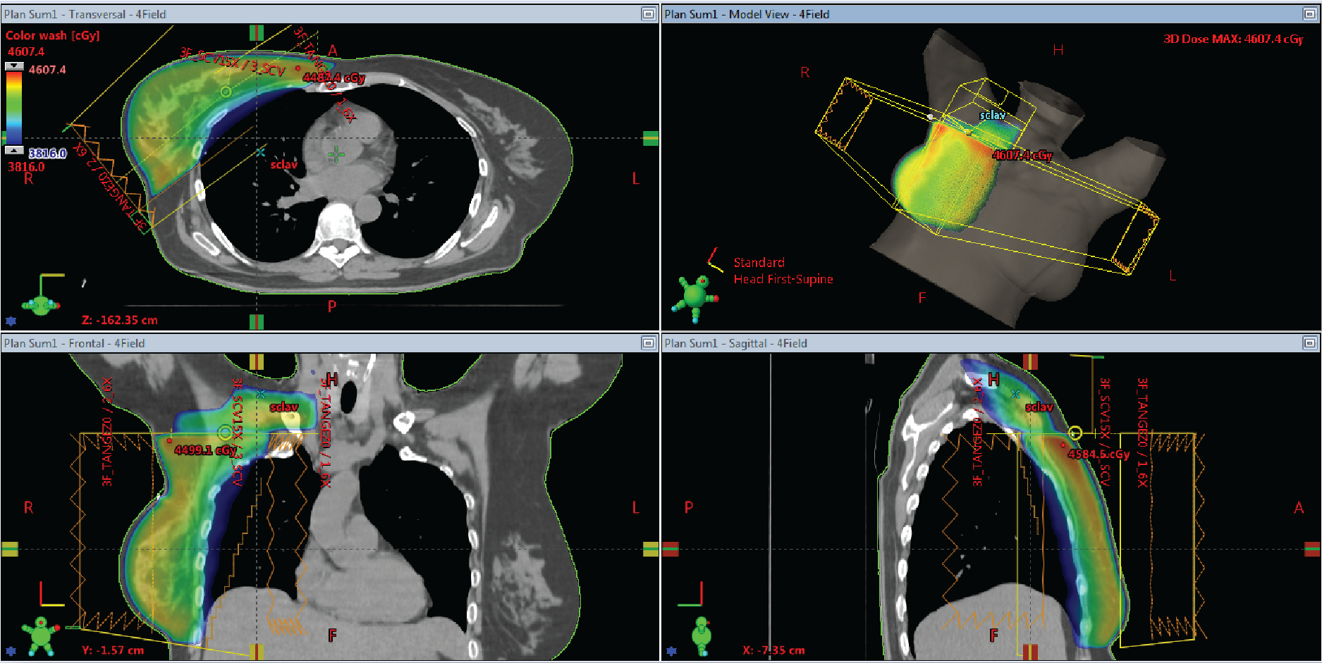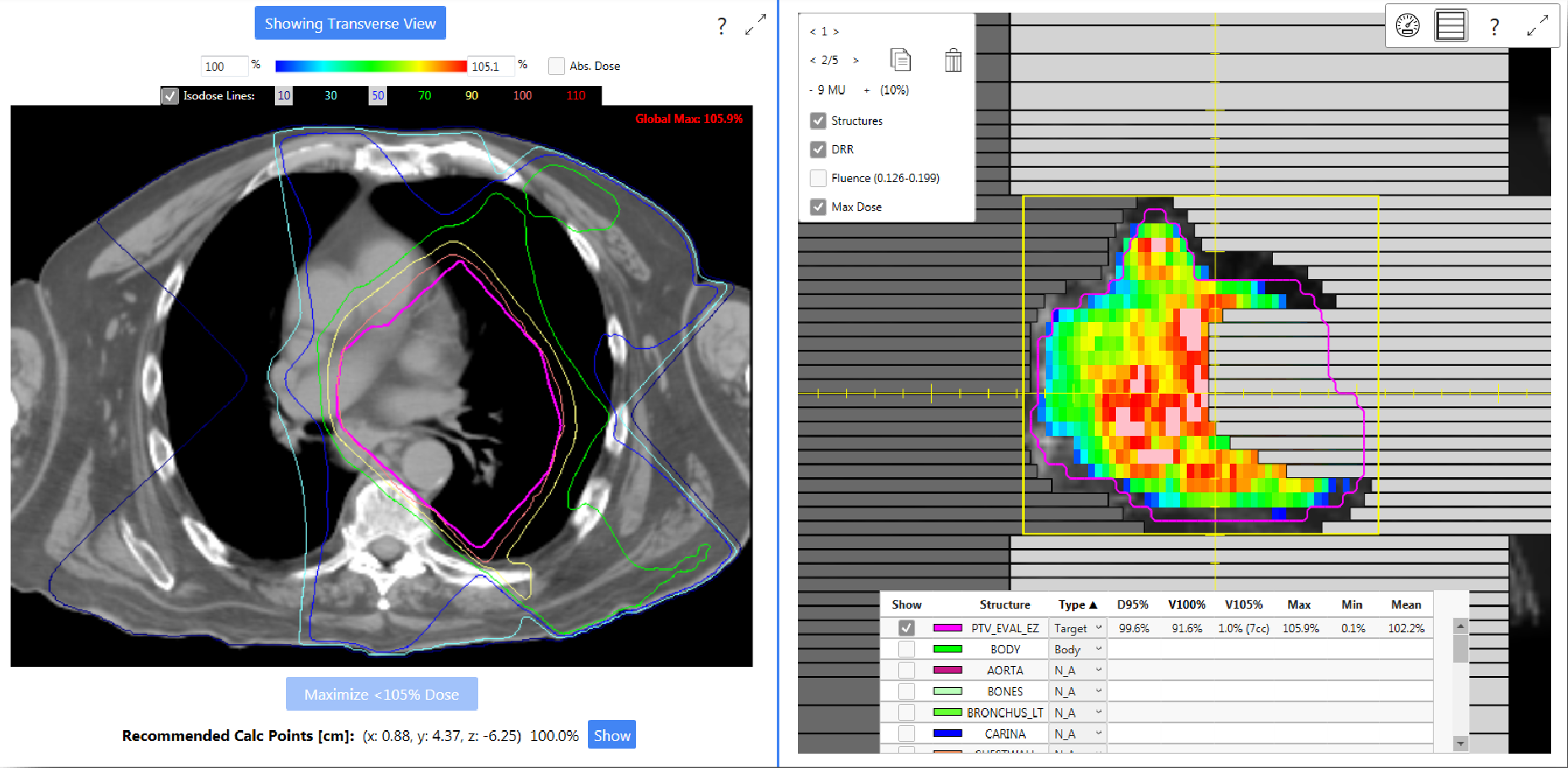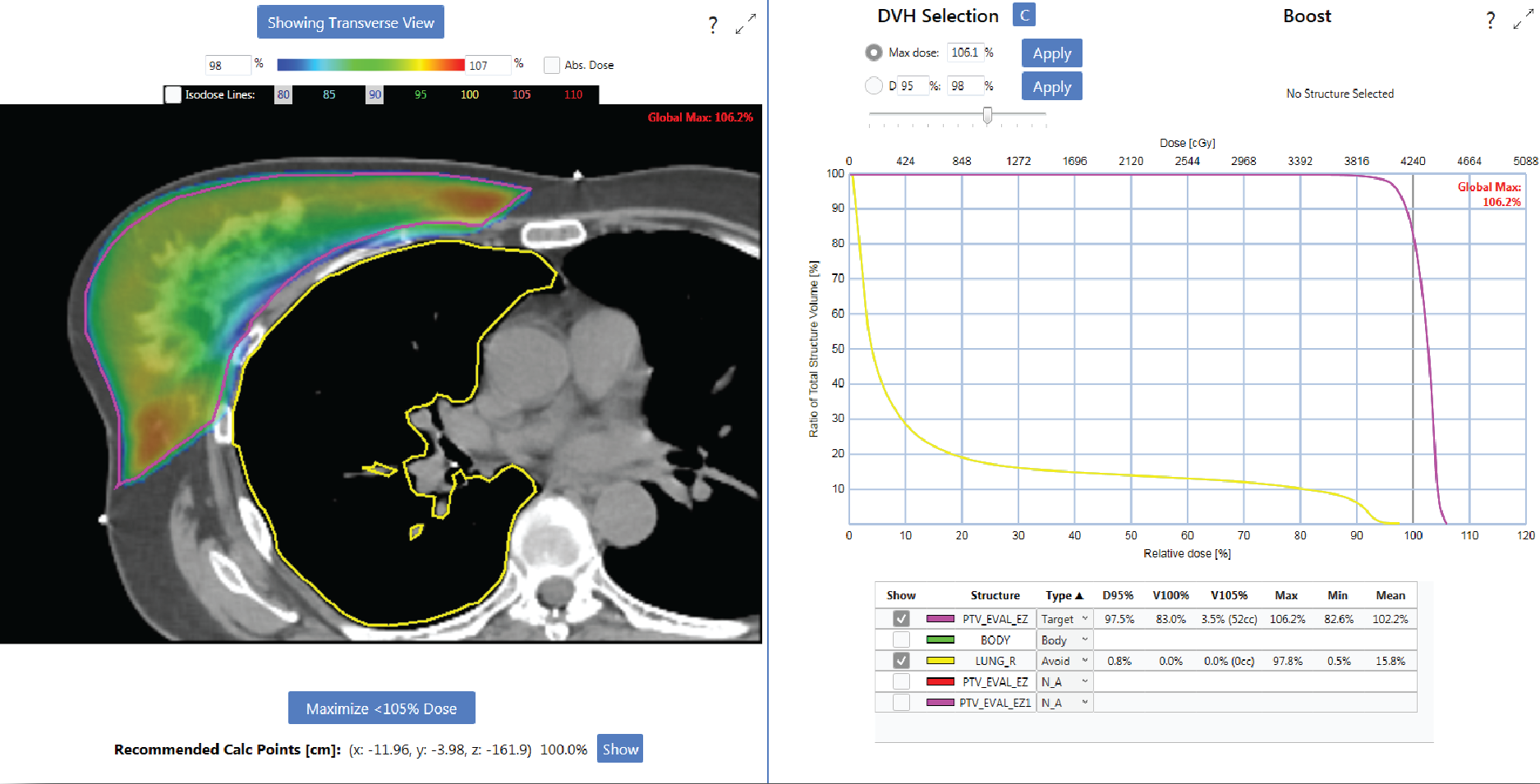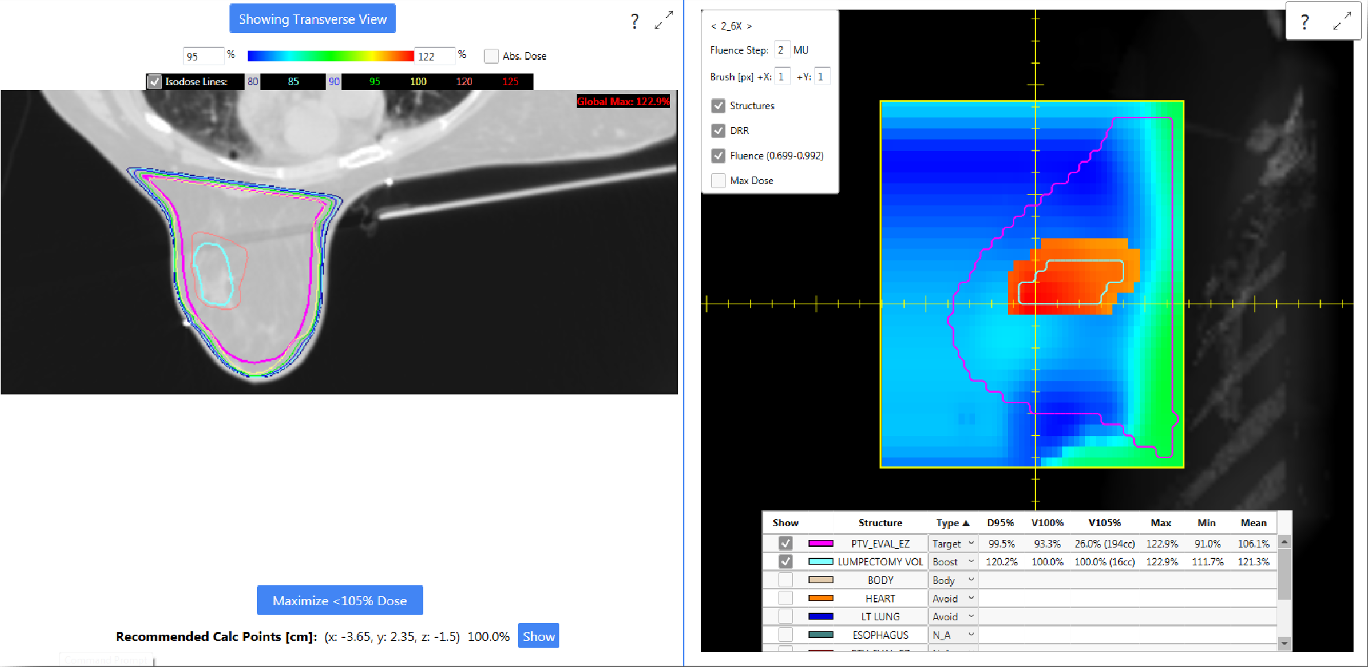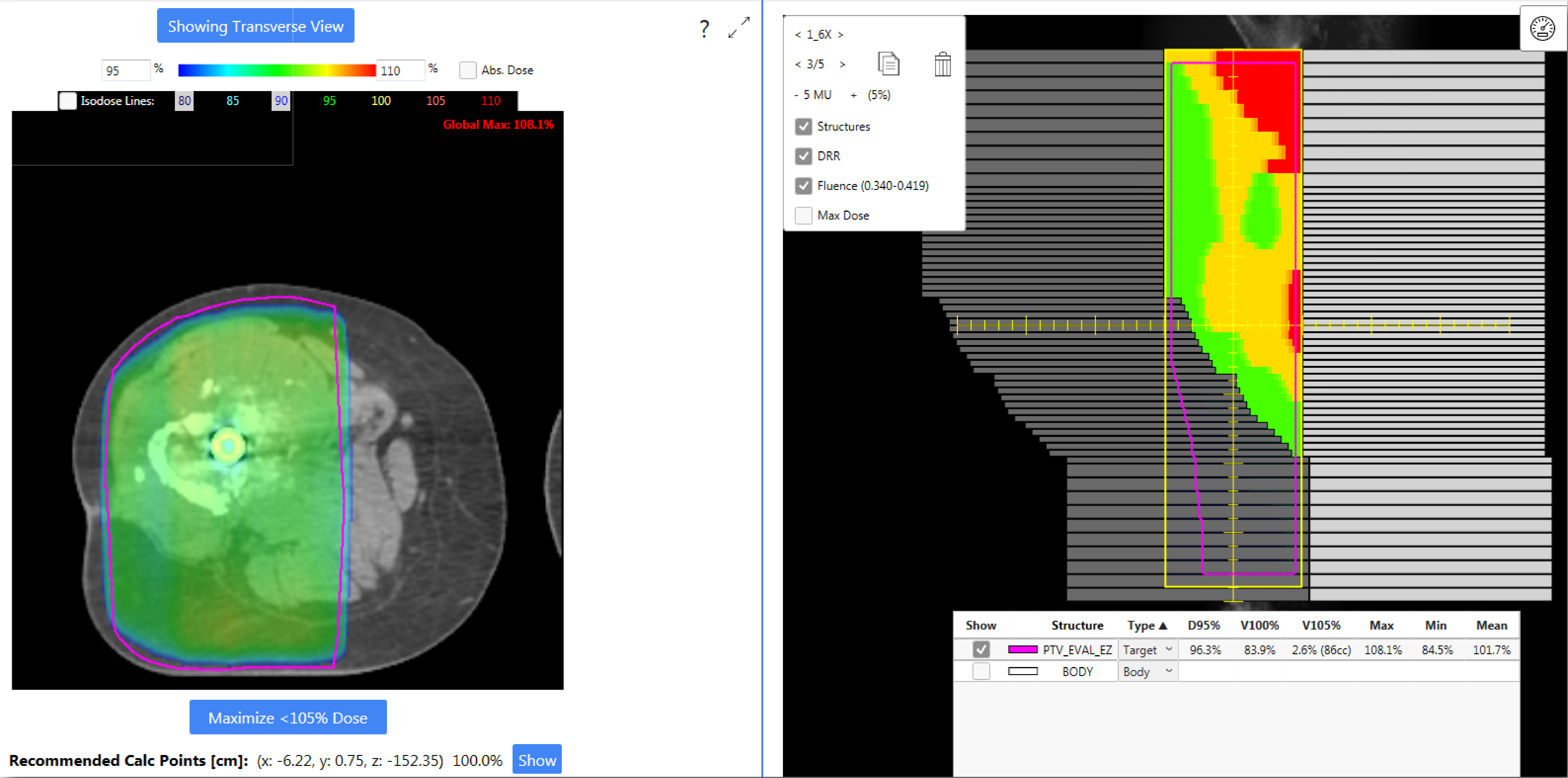EZFluence follows ASTRO’s guidelines for whole breast treatment. Automate field-in-field** and e-comp* planning. Optimize coverage while minimizing the maximum dose and V105%.